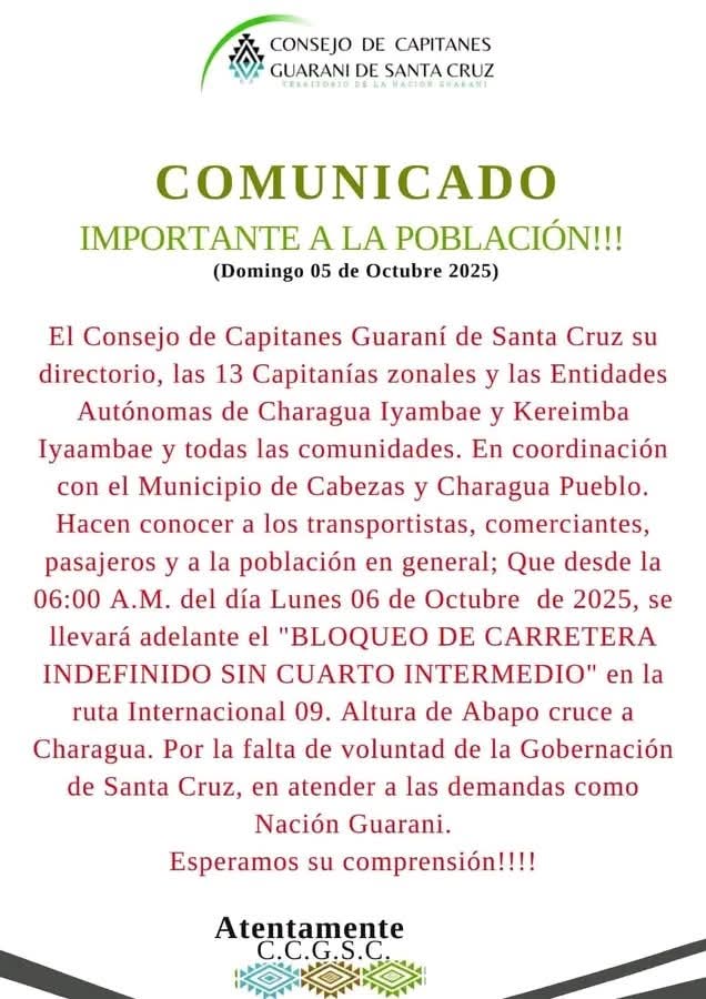El Consejo de Capitanes Guaraní de Santa Cruz inició este lunes un bloqueo indefinido en la carretera que conecta la capital cruceña con la ciudad de Camiri y la ruta internacional hacia Argentina. La medida, que comenzó a las 06:00 en el sector de Abapó, municipio de Cabezas, tiene como principal exigencia la presencia del gobernador Luis Fernando Camacho para instalar una mesa de diálogo.
