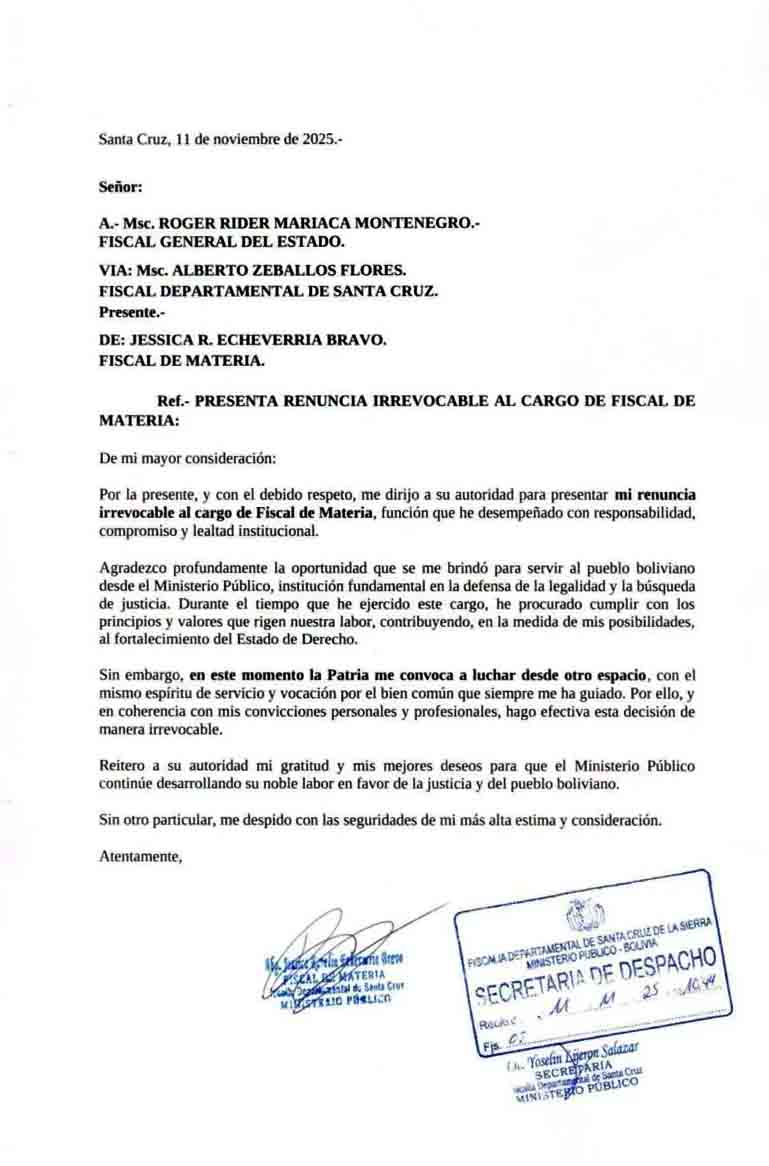 Jessica Echeverría, la fiscal que conducía la investigación por violencia intrafamiliar en contra de Luis Marcelo Arce Mosqueira, hijo del expresidente Luis Arce, presentó su renuncia irrevocable al cargo. En una carta dirigida al fiscal general Roger Mariaca, Echeverría argumentó que “la patria me convoca a luchar desde otro espacio”, anunciando su transición a una nueva función pública.