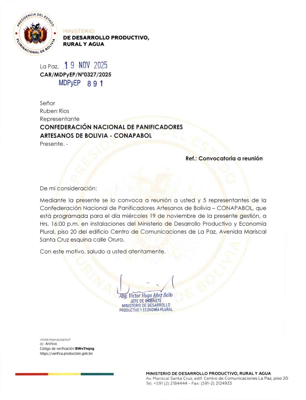 El Gobierno nacional, a través del Ministerio de Desarrollo Productivo, citó a una reunión a la Confederación Nacional de Panificadores Artesanos de Bolivia (Conapabol) para este miércoles en la ciudad de La Paz. El encuentro busca abordar la crítica escasez de pan de batalla y el irregular abastecimiento de harina subvencionada que afecta al país.