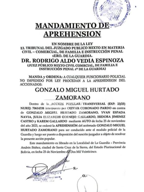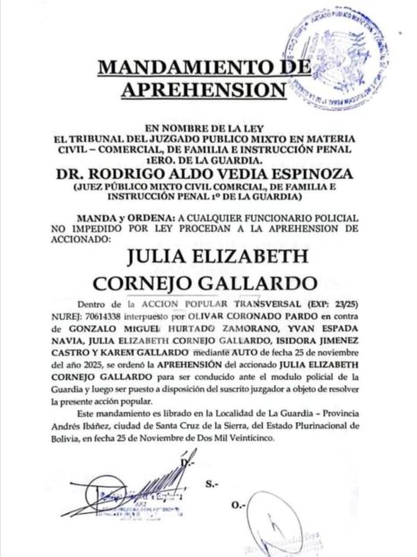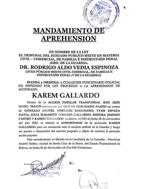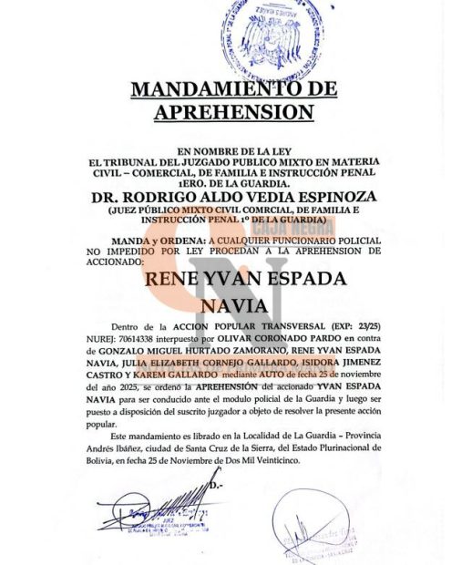 El abogado Oliver Coronado informó este martes que la justicia ordenó la aprehensión de cuatro magistrados del Tribunal Constitucional Plurinacional (TCP) que se autoprorrogaron en sus cargos. Simultáneamente, se emitió una alerta migratoria contra cinco de ellos para impedir que abandonen el país. Las medidas judiciales avanzan por el presunto delito de permanencia irregular en funciones, luego de que los magistrados extendieran sus mandatos de manera controversial. Las autoridades prevén ejecutar las órdenes de aprehensión en la ciudad de Sucre, sede del Órgano Judicial y del TCP. Imputados con orden de aprehensión De acuerdo con la información oficial, los mandamientos de aprehensión fueron emitidos contra: Julia Elizabeth Cornejo Gallardo René Iván Espada Navia Karem Gallardo Gonzalo Miguel Hurtado Zamorano Coronado, en declaraciones a la red Uno, confirmó que "estos mandamientos vamos a ejecutar en Sucre". Alerta migratoria para cinco exmagistrados […]