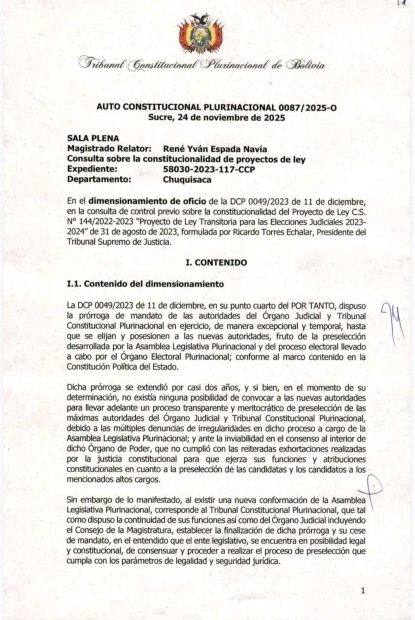 El Tribunal Constitucional Plurinacional (TCP) dispuso el cese de mandato de cinco de sus nueve miembros y dos del Tribunal Supremo de Justicia (TSJ), quienes ejercían desde diciembre de 2023 bajo una prórroga excepcional. La decisión fue emitida mediante el Auto Constitucional 0087/2025-0, fechado el 24 de noviembre en Sucre.