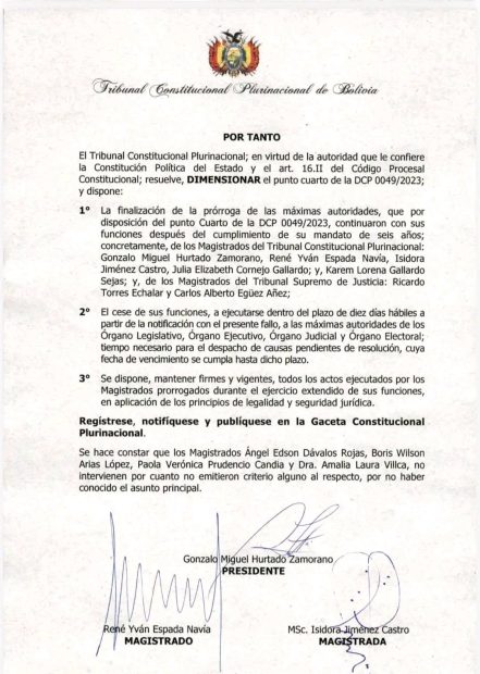 La prórroga fue otorgada en diciembre de 2023 mediante la Declaración Constitucional Plurinacional (DCP) 0049/2023. Esta extendía de forma “excepcional y temporal” el mandato de las autoridades del Órgano Judicial y del TCP debido a la imposibilidad de llevar adelante un proceso de preselección transparente y consensuado en la Asamblea Legislativa.